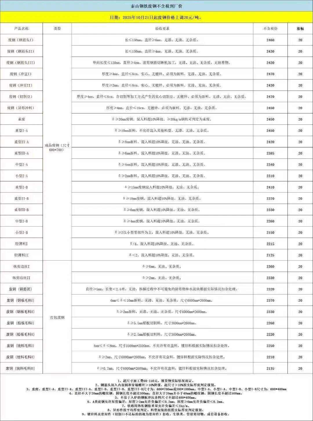 山東泰山鋼鐵通知:**月**日起,廢鋼不含稅到廠價(jià)格上調(diào)**元/噸。
