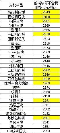 石橫****年**月**日起,零稅率價(jià)格下調(diào)**元/噸,具體如下:*%增值稅價(jià)格為:重三****(社會重廢厚度≥*mm);重二****(社會重廢厚度≥*mm;無銹蝕新料厚度≥*.*mm);重一****(社會重廢厚度≥**mm;無銹蝕新料厚度≥*.*mm);薄花料****(社會重廢厚度≥**mm;無銹蝕新料≥*.*mm);管頭花料****(社會重廢厚度≥**mm;無銹蝕新料厚度≥*.* mm);鋼筋壓塊****、特級破碎料****、鍍鋅壓塊****、螺紋鋼壓塊****。含鋅廢鋼同步下調(diào)**元/噸,具體如下:*%增值稅價(jià)格為:含鋅重三****、含鋅重二****、含鋅重一****、含鋅薄花料****、含鋅管頭花料****。