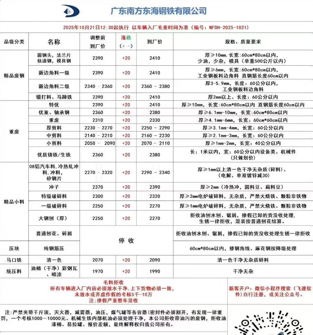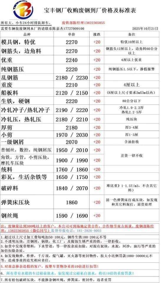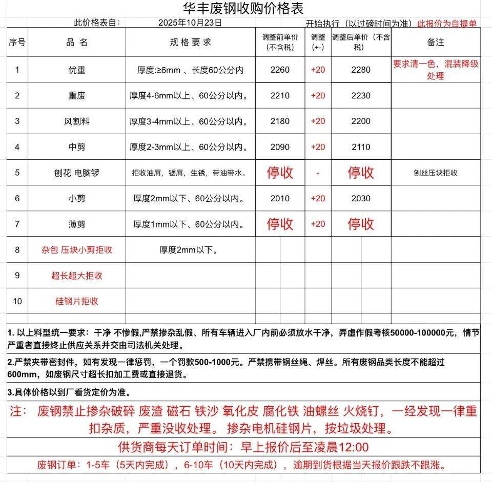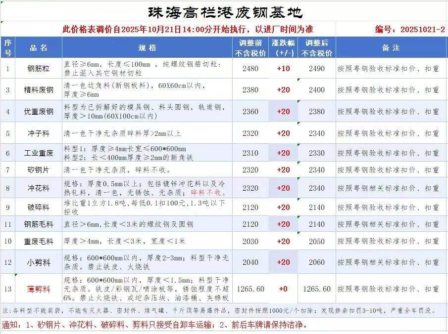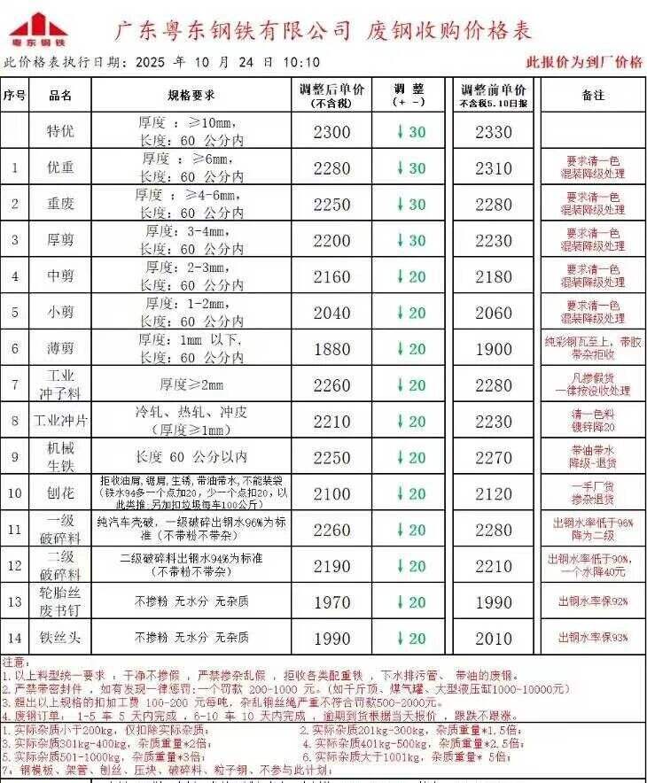 **日廣東南方東海廢鋼調(diào)整:模具鋼****,新邊角料一級(jí)****,新邊角料二級(jí)****一****,馬蹄鐵****,特優(yōu)****,優(yōu)重****,重廢****,厚剪料****-****,中剪料****一****,小剪料****-****,優(yōu)質(zhì)鑄鐵/生鐵****-****,冷熱軋沖料****-****,沖子****-****,特級(jí)破碎料****,一級(jí)破碎料****-****,大鋼刨(厚)****,普通刨花、碎屑****,純鋼筋壓停收,清一色****,彩鋼瓦****。