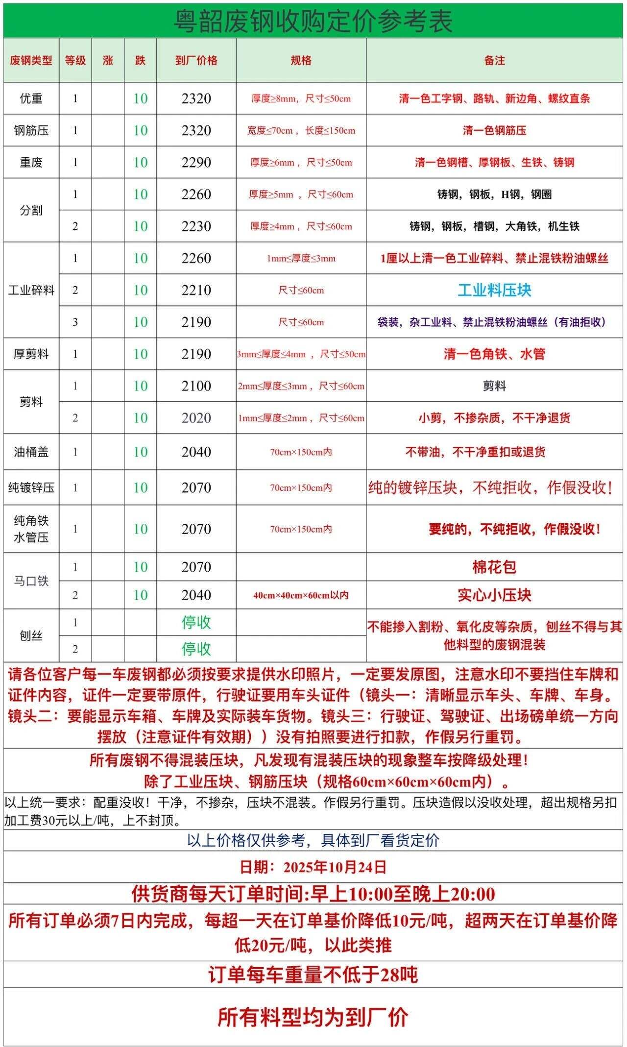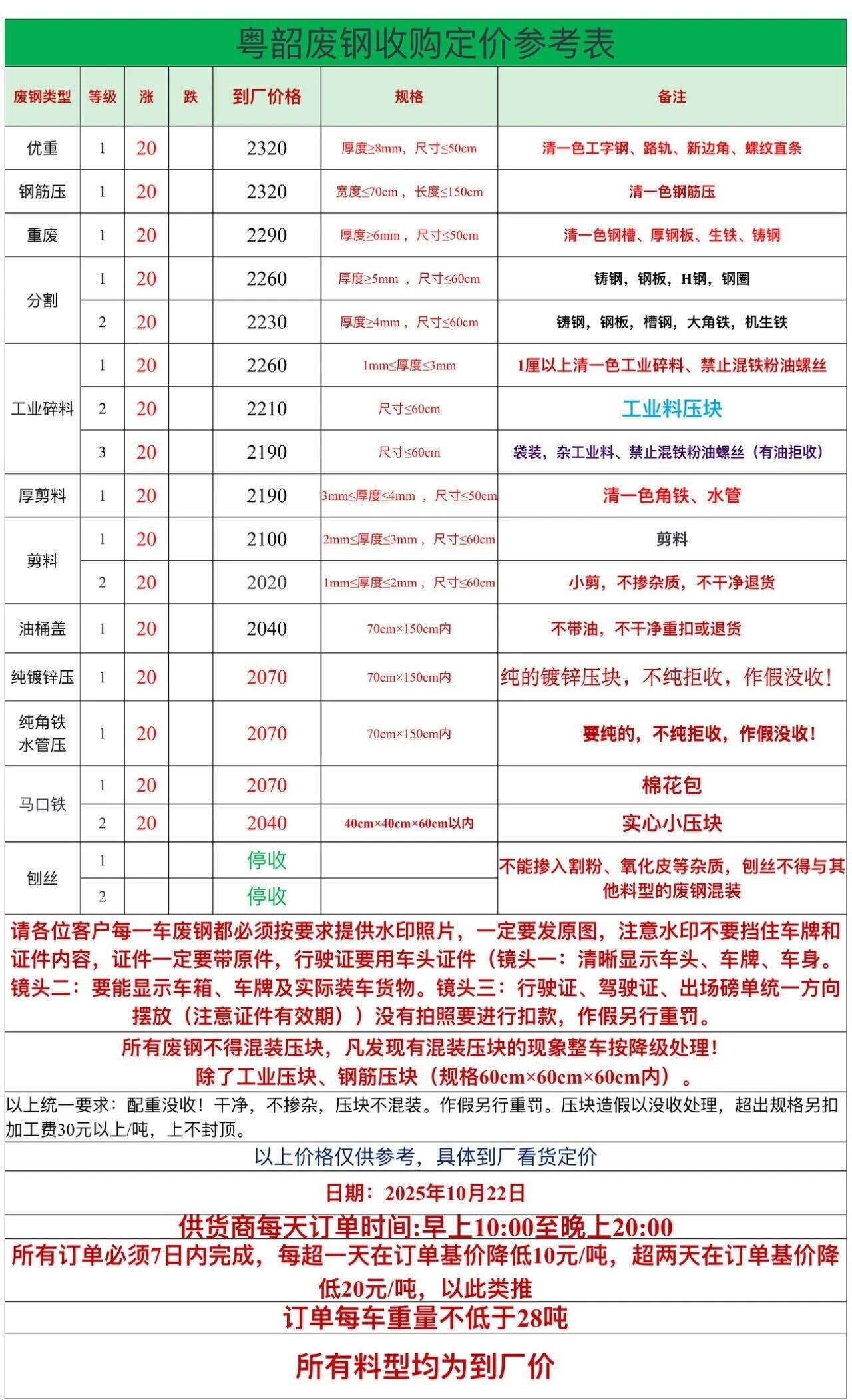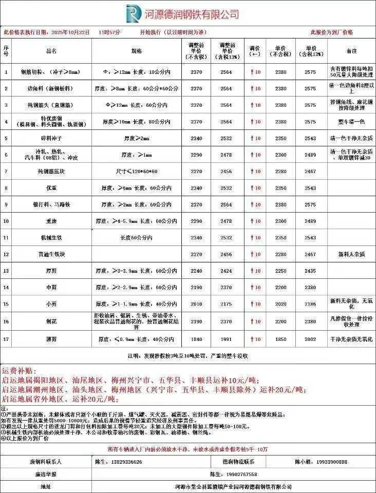 **日廣東河源德潤(rùn)廢鋼漲**,鋼筋切粒****,邊角料(新鋼板料)****;直鋼筋、純鋼筋頭****;模具鋼、料頭圓鋼、軌道鋼、火車輪****;碎料沖子****;冷軋、熱軋****,;純鋼筋壓塊****,優(yōu)重****;鍛打料、馬蹄鐵****;重廢****;機(jī)械生鐵、高碳鋼、鑄鋼件、生熟混裝****;厚剪****,中剪****,小剪、打包料****,普刨花****,薄剪****不含稅。