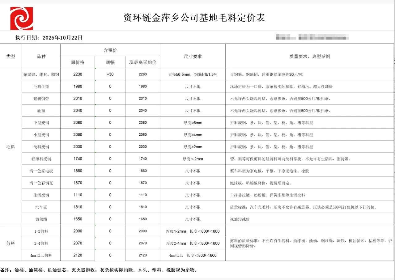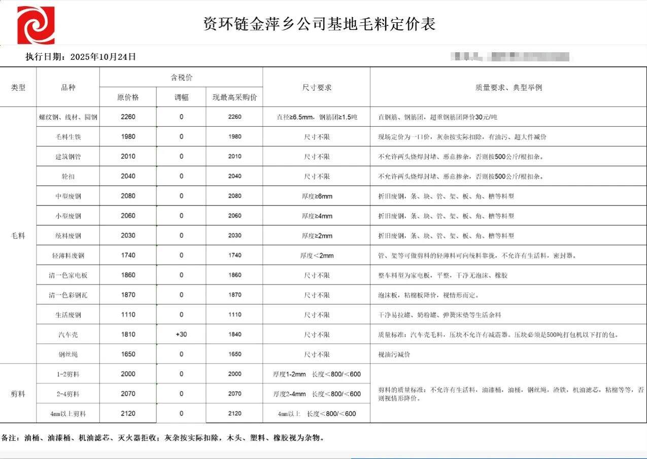 **月**日資環(huán)鏈金萍鄉(xiāng)公司中心加工基地收貨價格: