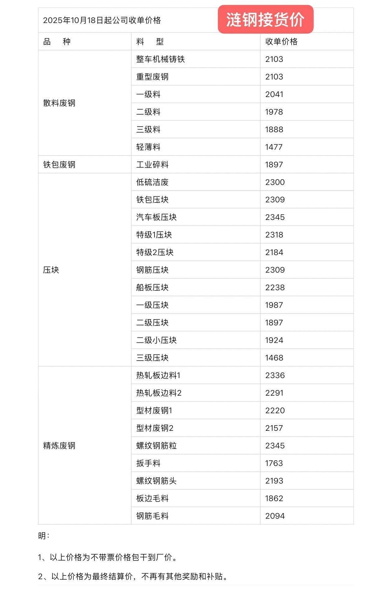 **日湖南漣鋼汽運接單價:散料廢鋼:整車機械鑄鐵****重型廢鋼****一級廢鋼****輕薄料****;壓塊:特級壓塊一****鋼筋壓塊****一級壓塊****二級壓塊****汽車板壓塊****精煉廢鋼:螺紋鋼筋粒****扳手料****不含稅。