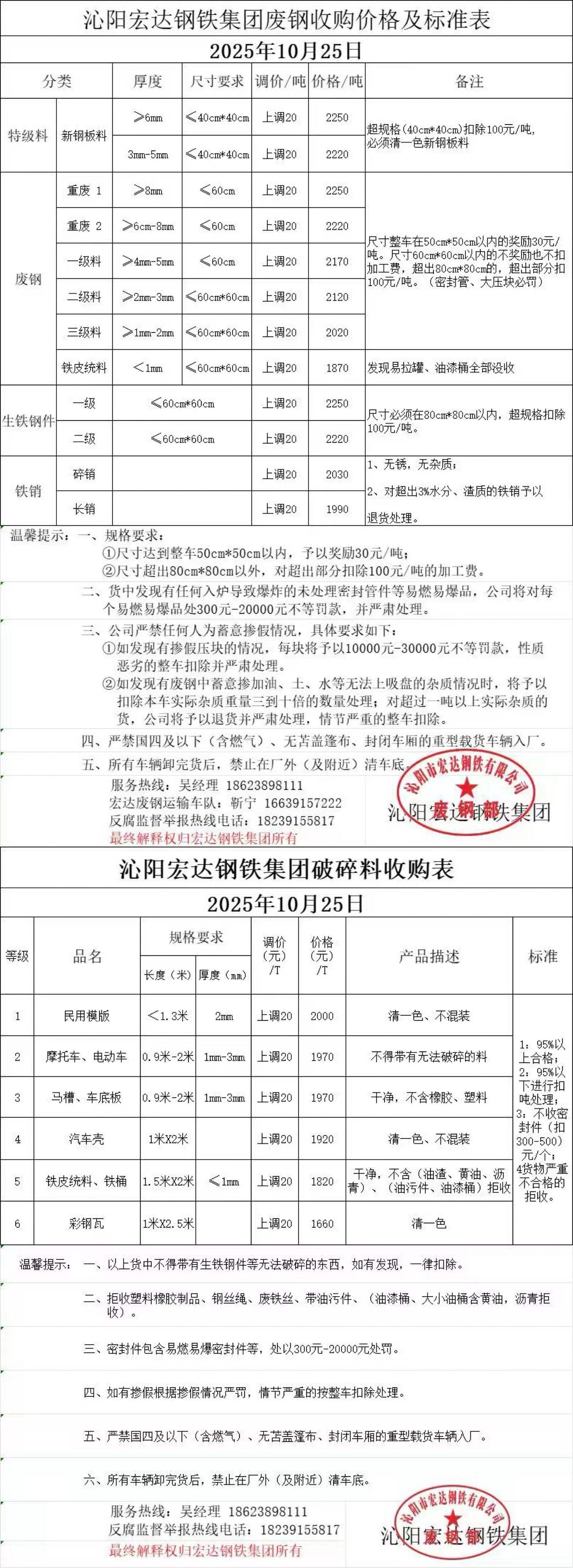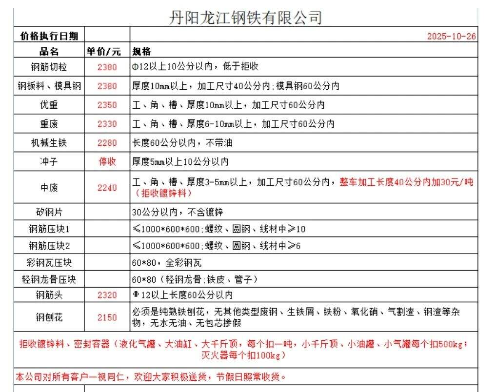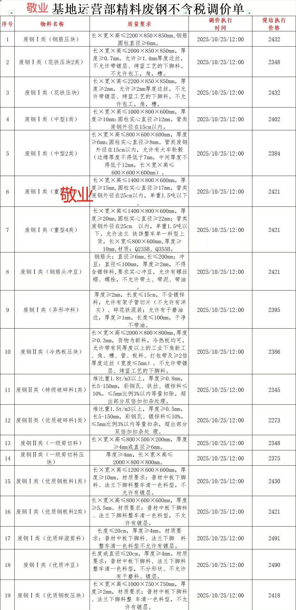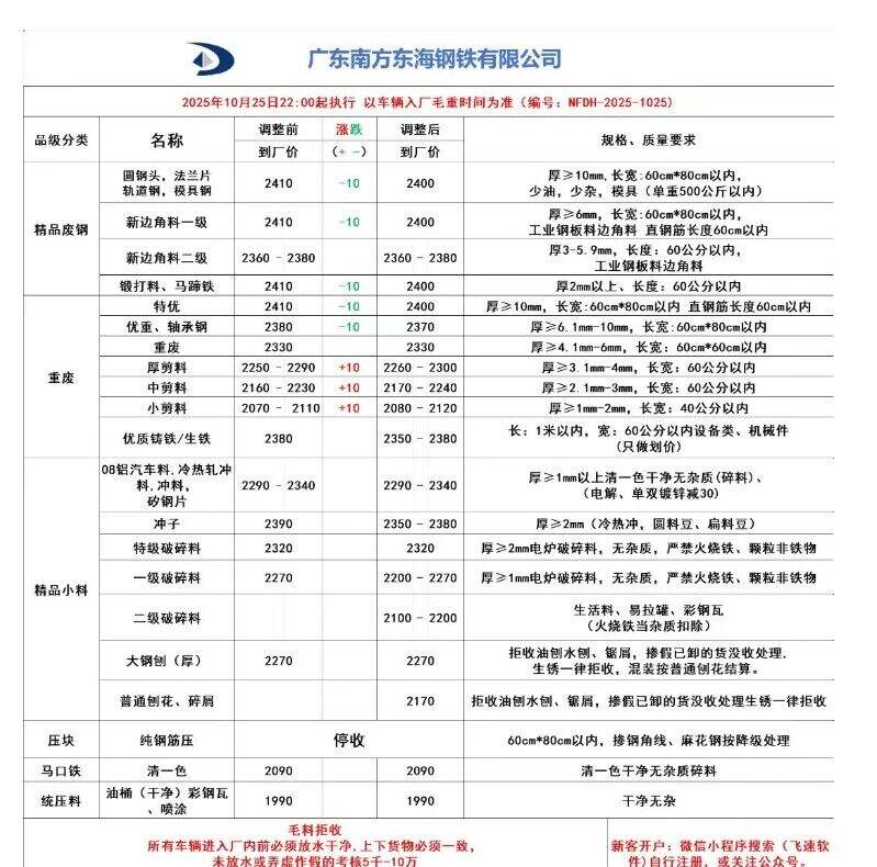 **日廣東南方東海廢鋼調(diào)整:模具鋼****,新邊角料一級****,新邊角料二級****一****,馬蹄鐵****,特優(yōu)****,優(yōu)重****,重廢****,厚剪料****-****,中剪料****一****,小剪料****-****,優(yōu)質(zhì)鑄鐵/生鐵****-****,冷熱軋沖料****-****,沖子****-****,特級破碎料****,一級破碎料****-****,大鋼刨(厚)****,普通刨花、碎屑****,純鋼筋壓停收,清一色****,彩鋼瓦****。