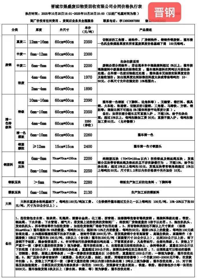 **月**日山西晉鋼廢鋼下調(diào)**,執(zhí)行價(jià):重廢二****,中廢一****,中廢二****,*-*厚輕廢****,清一色**-**厚特級****,清一色*-**厚特級****,清一色*-*厚特級****,清一色模板****,清一色鋼筋顆粒****,*-*厚鋼筋壓塊****,*-**厚鋼筋壓塊****,鋼板壓塊****,模板壓塊****,不含稅。